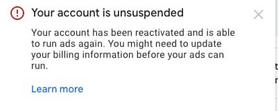 Finally, and after nearly three weeks of pleading through the text box appeal void, an unceremonious message appears within my Google Ads account: